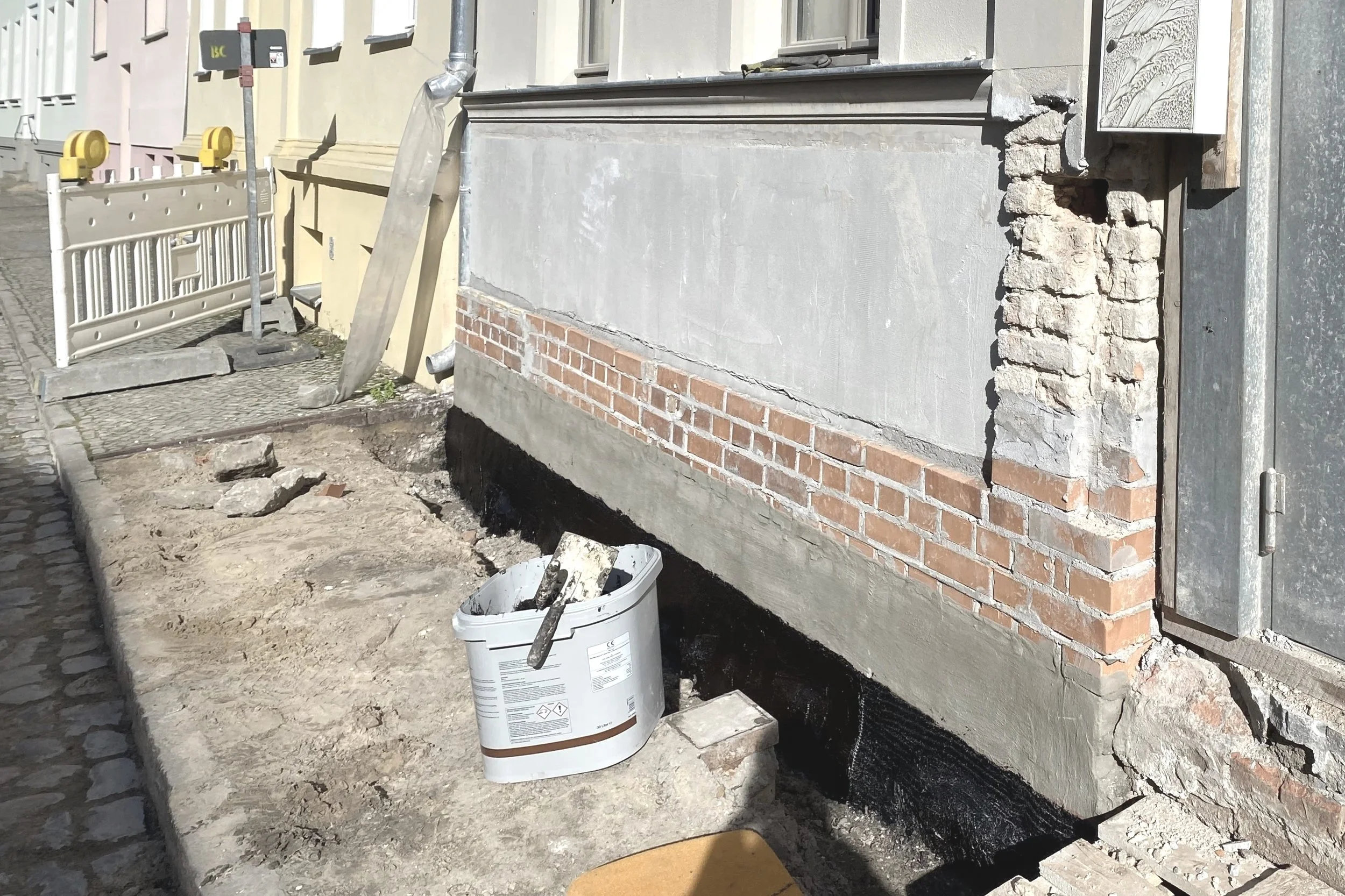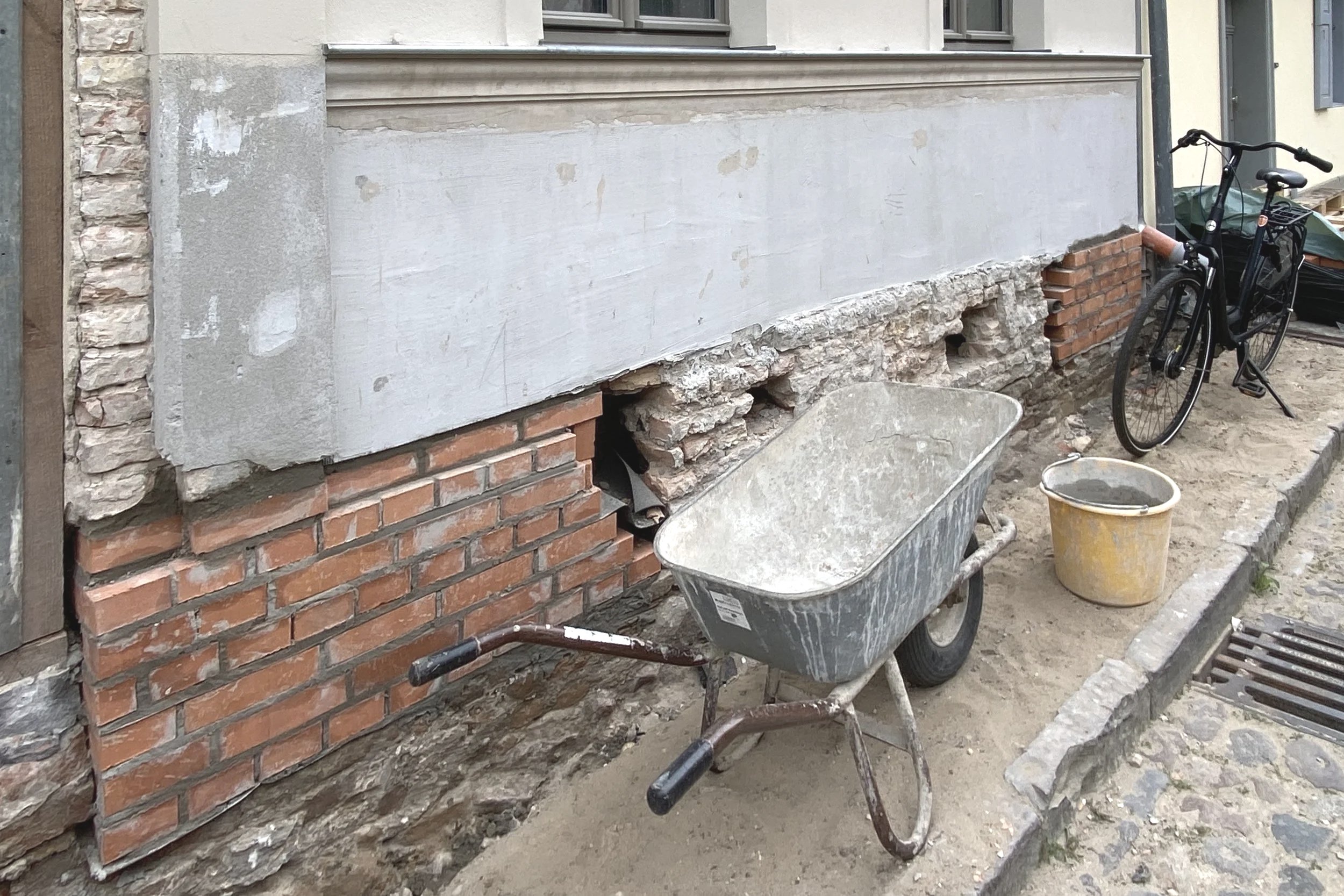 Marode Fundamente wurden abschnittweise freigelegt und nachgemauert, der Keller um 80cm tiefer gelegt, eine neue Stahltreppe eingebaut und die Ziegel der Kellerwände sandgestrahlt. Morsche Zwischendecken wurden in EG und OG nach dem Freilegen und Ausbau der Kunststoff-Oberböden sichtbar und Zimmerdecken wurden teilweise ausgetauscht gegen Stahl-Steindecken.