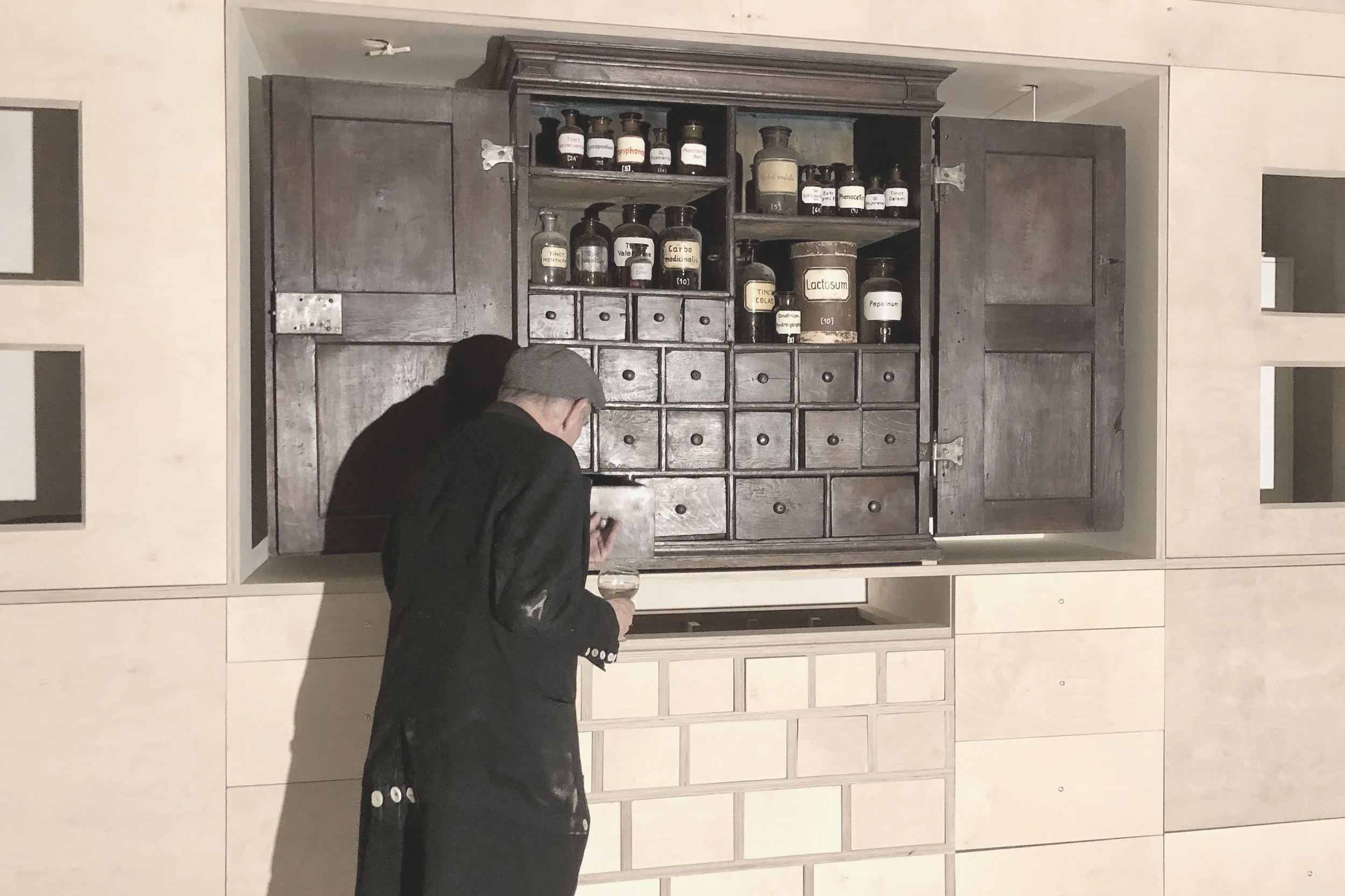 Entsprechend dieser Idee ist das Foyer der hypothetischen Arbeitssituation Peschels und Ratzenbergers geplant. Die BesucherInnen betreten den Raum und der Blick fällt unmittelbar auf den gegenüberliegenden Wandschrank. Dessen Gestaltung ist inspiriert von einem kleinen originalen, der Zeit der Renaissance zuzuordnenden Apothekerschrank. Dieser wird mittig in den modernen Wandschrank eingebaut, der damit zu einer Bühne oder Rahmung wird.
